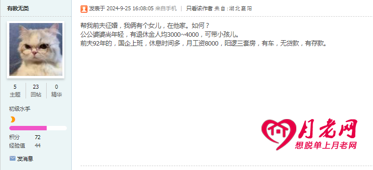 中国好前妻,什么样的好前妻会帮离婚的前夫征婚,今天看到一个征婚贴: 湖北洛阳的ID叫有教无类的网友: 帮我前夫征婚,我俩有个女儿,在他家。如何? 公公婆婆尚年轻,有退休金人均3000~4000,可带小孩儿。 前夫92年的,国企上班,休息时间多,月工资8000,阳逻三套房,有车,无贷款,有存款。 http://www.71name.com/diary/85.html 你现在还单身是因为月老为你准备了更好的人!